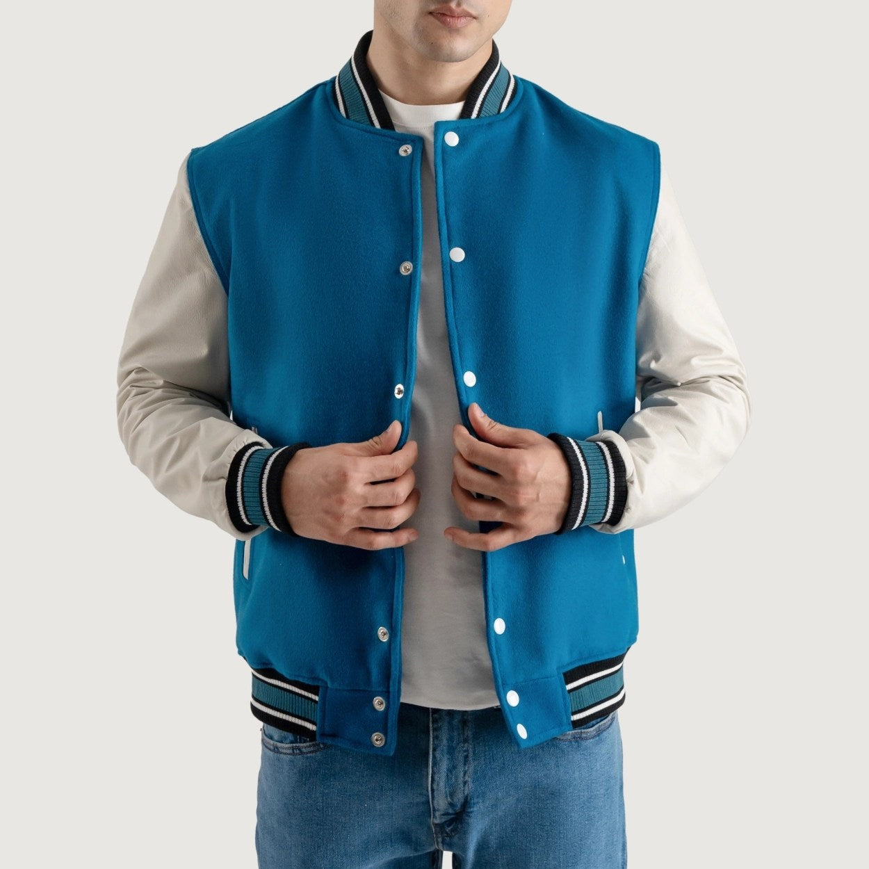 Deep Mid Sky Blue and White Varsity Letterman Jacket